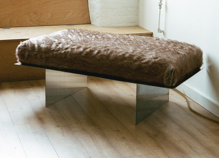 Folded aluminium sheet with upholstered faux fur wadded cushion